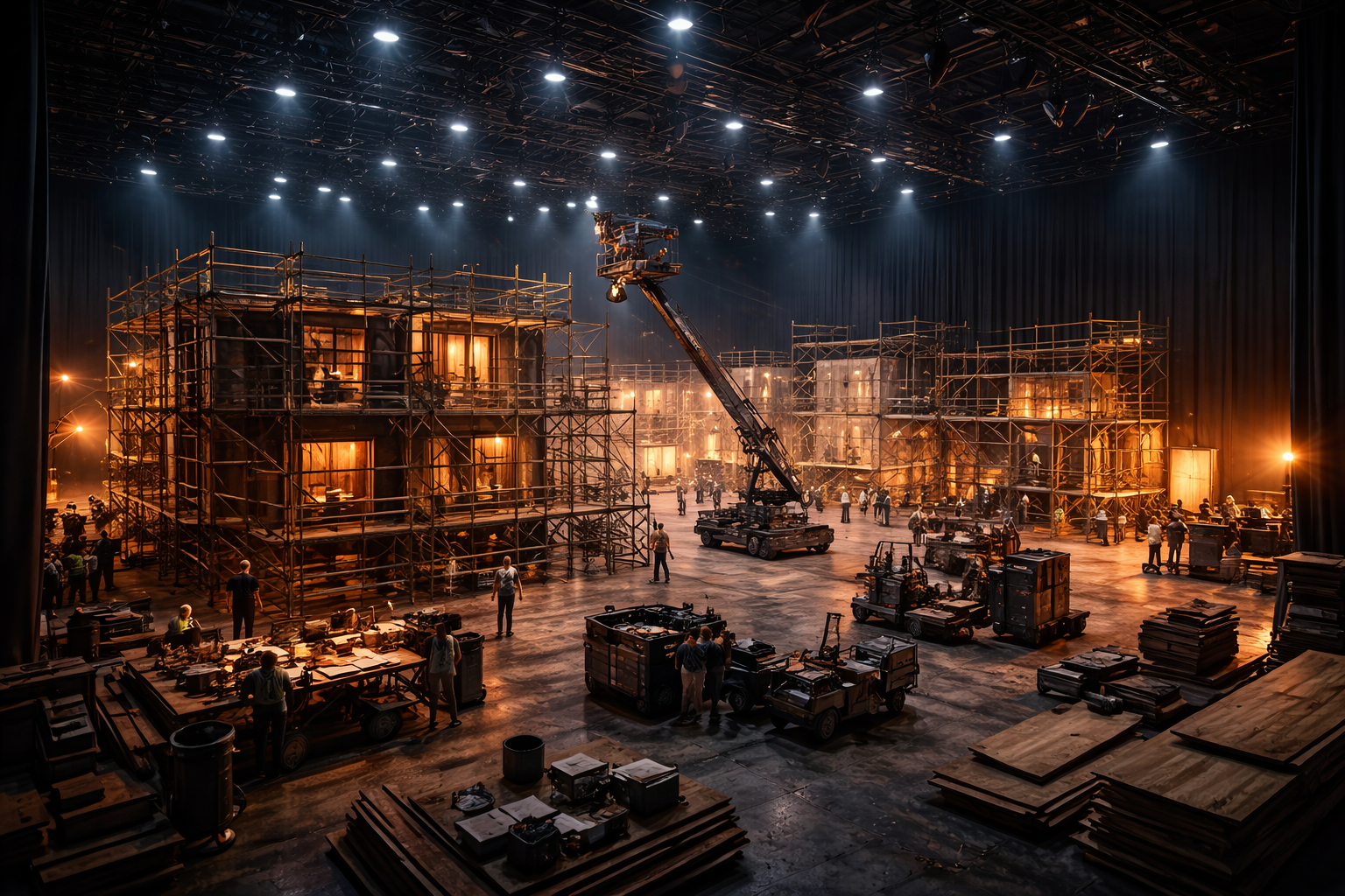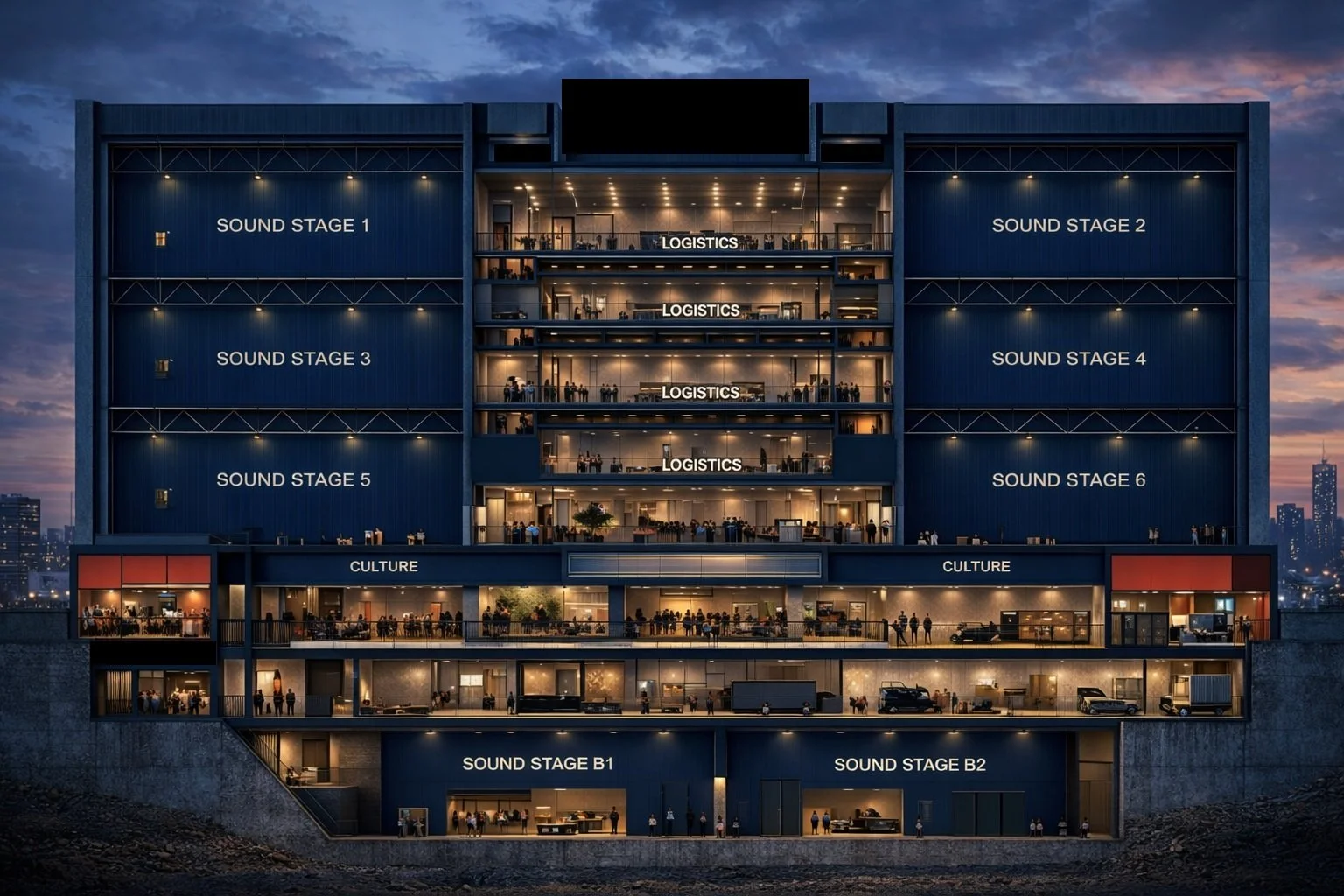 Eight sound stages stacked across multiple levels, enabling multiple productions to operate simultaneously.