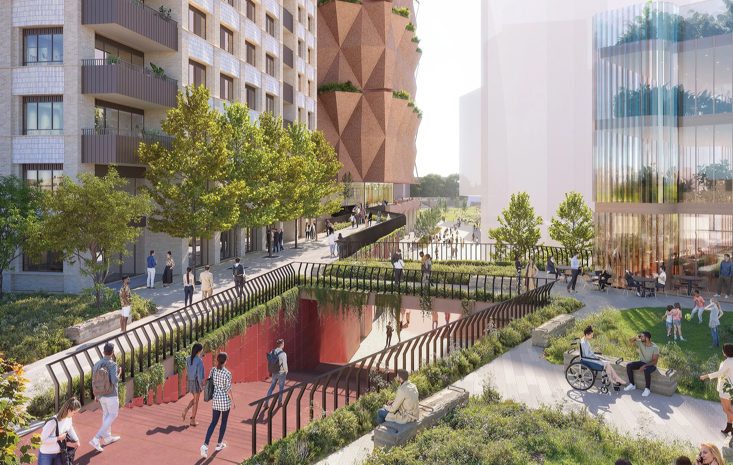 Play areas are thoughtfully integrated throughout the site, including within parks, gardens and podium spaces. By combining play features with seating, planting and clear pathways, these areas are designed to be safe, visible and easy to access, while also encouraging social interaction and everyday use