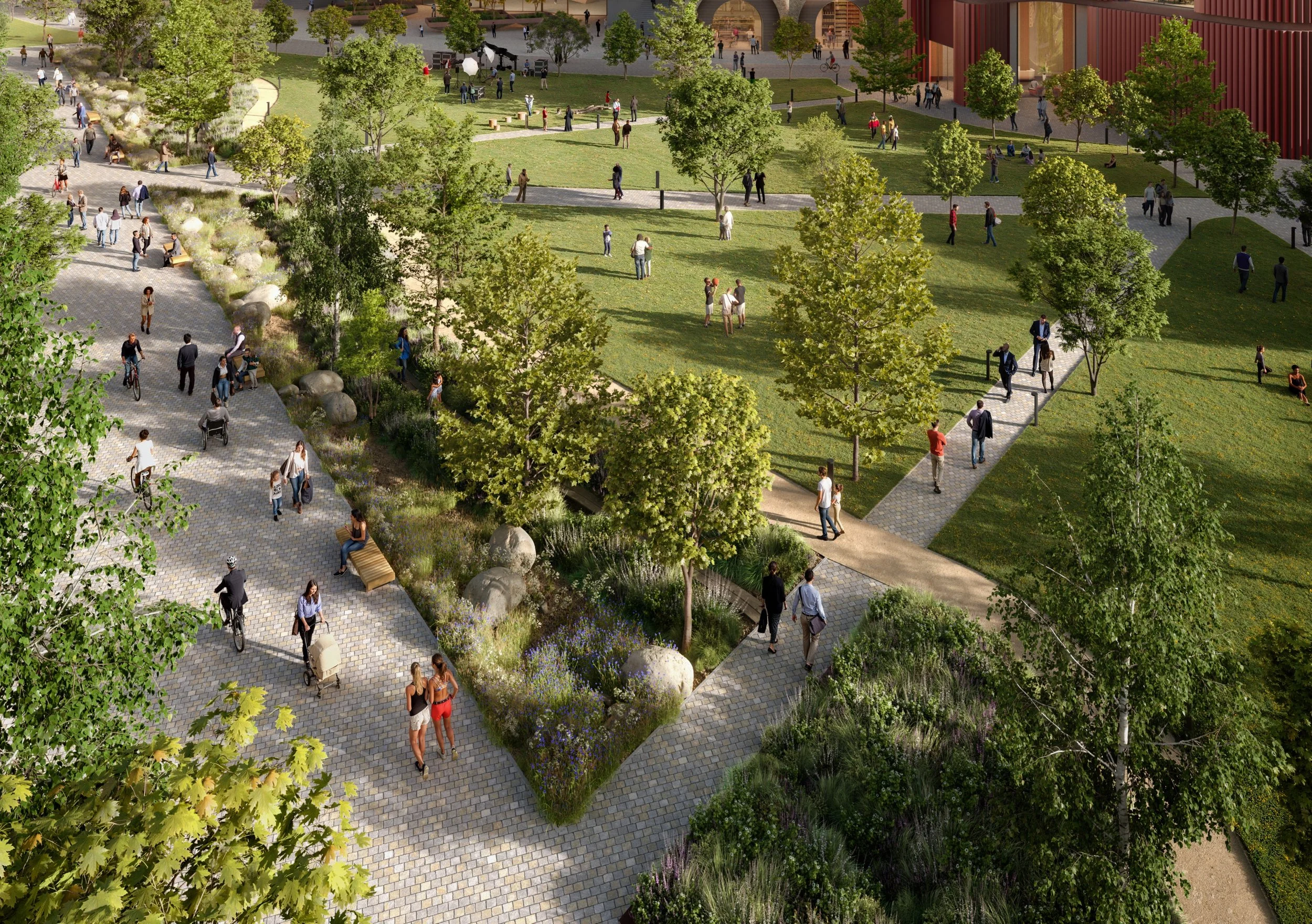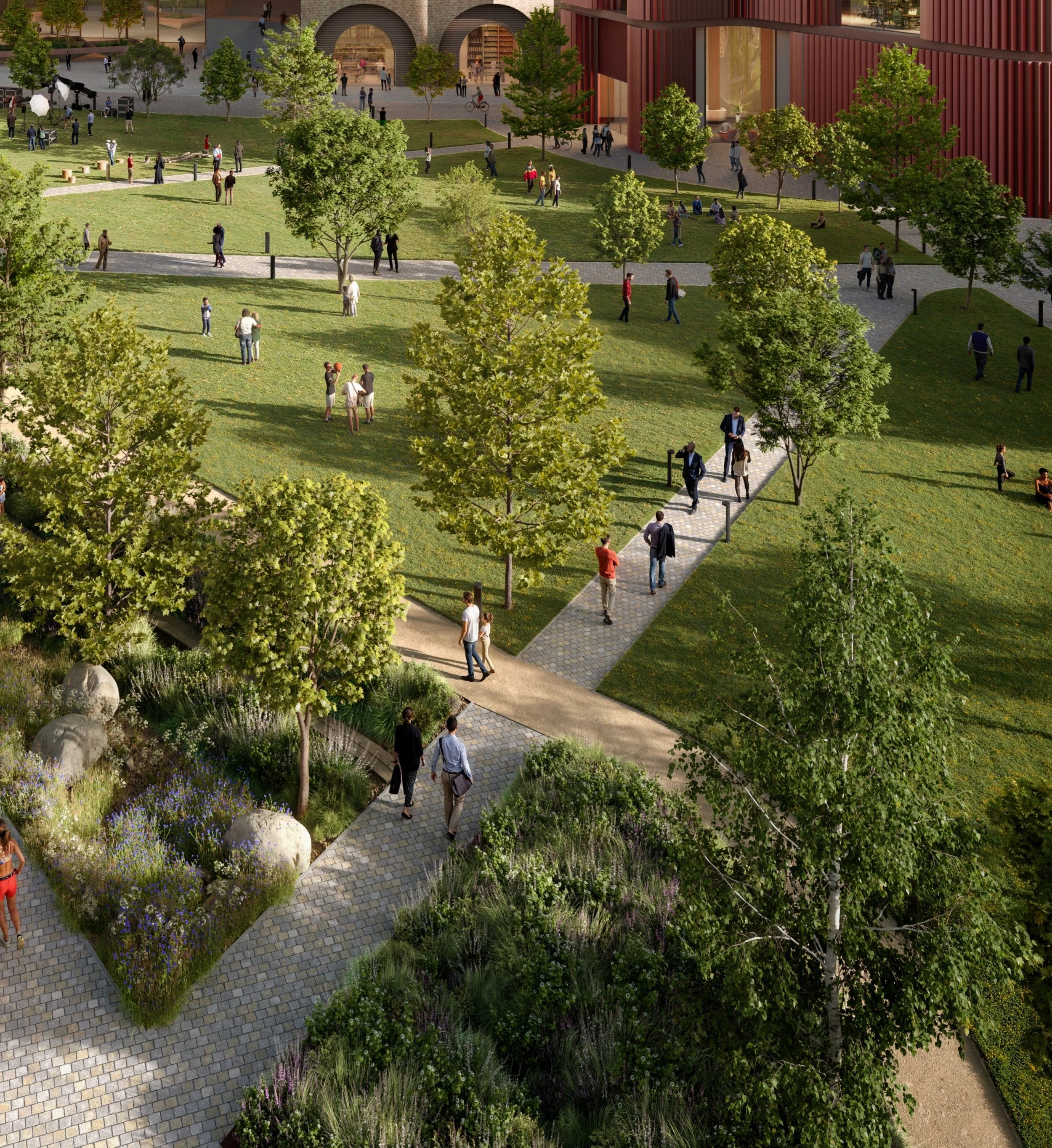 These spaces combine planting, seating and walking routes, creating quieter areas to sit, take a break or meet others. They are designed for a mix of people, including workers, students and visitors, and offer a more relaxed setting away from street level.
