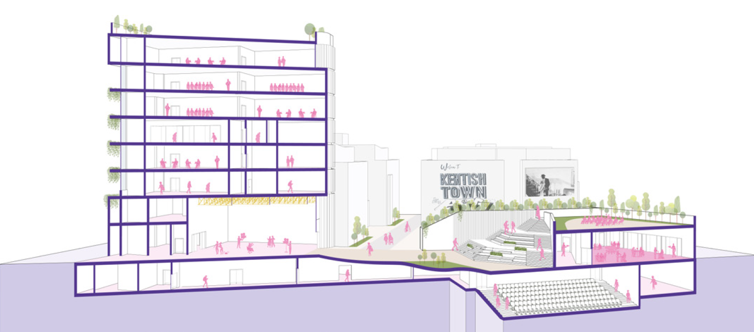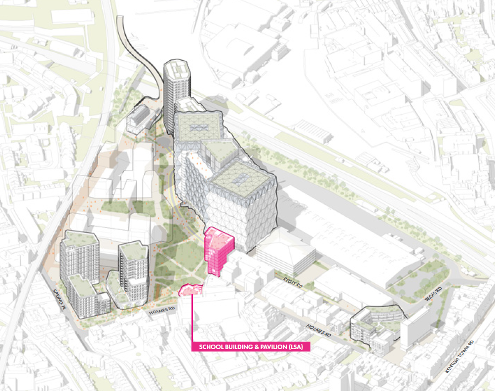 The school is located at the entrance to the site from Regis Road, next to Inkerman Fields and opposite the main film studios. This prominent position is intentional, it creates a welcoming front door to the neighbourhood and reflects the ambition for Camden Film Quarter to be open, inclusive and connected to the local community.